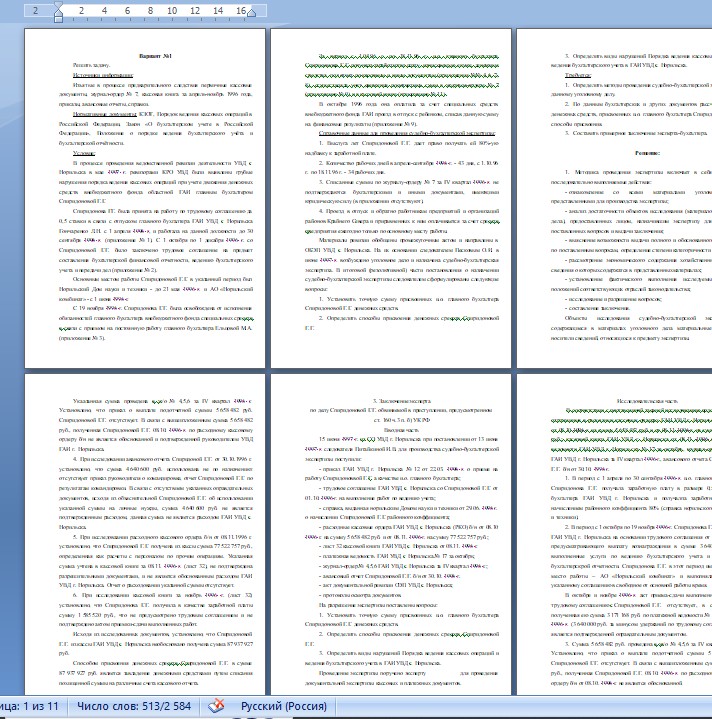 Судебная бухгалтерская экспертиза, контрольная работа (4795) Вариант №1 Решить задачу. Источники информации: Изъятые в процессе предварительного следствия первичные кассовые документы, журнал-ордер № 7, кассовая книга за апрель-ноябрь 1996 года, приказы, авансовые отчеты, справки. Нормативные документы: КЗОТ, Порядок ведения кассовых операций в Российской Федерации, Закон «О бухгалтерском учете в Российской Федерации», Положение о порядке ведения бухгалтерского учёта и бухгалтерской отчётности. Условие: В процессе проведения ведомственной ревизии деятельности УВД г. Норильска в мае 1997 г. ревизорами КРО УВД были выявлены грубые нарушения порядка ведения кассовых операций при учете движения денежных средств внебюджетного фонда областной ГАИ главным бухгалтером Спиридоновой Г.Г. Спиридонова ГГ. была принята на работу по трудовому соглашению да 0,5 ставки в связи с отпуском главного бухгалтера ГАИ УВД г. Норильска Гончаренко Л.Н. с 1 апреля 1996 г, и работала на данной должности до 30 сентября 1996 г. (приложение № 1). С 1 октября по 1 декабря 1996 г. со Спиридоновой Г.Г. было заключено трудовое соглашение на предмет составления бухгалтерской финансовой отчетности, ведению бухгалтерского учета и передачи дел (приложение № 2). Основным местом работы Спиридоновой Г.Г. в указанный период был Норильский Дом науки и техники – до 21 мая 1996 г. и АО «Норильский комбинат» – с 1 июня 1996 г. С 19 ноября 1996 г. Спиридонова Г.Г. была освобождена от исполнения обязанностей главного бухгалтера внебюджетного фонда специальных средств в связи с приемом на постоянную работу главного бухгалтера Ельцовой М.А. (приложение № 3). За период с 1.04.96 г. по 18.11.96 г. и.о. главного бухгалтера Спиридонова Г.Г, получала заработнзпю плату, начисляемую ею же, денежные средства, под отчет по кассовым и иным документам (приложения №№ 4, 6, 7, 8), осуществляла учет движения подотчетных сумм в журнале-ордере № 7 (приложение № 9) и в кассовой книге (приложение № 11). В октябре 1996 года она оплатила за счет специальных средств внебюджетного фонда ГАИ проезд в отпуск с ребенком, списав данную сумму на финансовые результаты (приложение № 9). Справочные данные для проведения судебно-бухгалтерской экспертизы: 1. Выслуга лет Спиридоновой Г.Г. дает право получать ей 80%-ую надбавку к заработной плате. 2. Количество рабочих дней в апреле-сентябре 1996 г. – 43 дня, с 1.10.96 г. по 18.11.96 г. – 34 рабочих дня. 3. Списанные суммы по журналу-ордеру № 7 за IV квартал 1996 г. не подтверждаются бухгалтерскими и иными документами, имеющими юридическую силу (в приложении отсутствуют). 4. Проезд в отпуск и обратно работникам предприятий и организаций районов Крайнего Севера и приравненных к ним оплачивается за счет средств предприятия ежегодно только по основному месту работы. Материалы ревизии обобщены промежуточным актом и направлены в ОБЭП УВД г. Норильска. На их основании следователем Песковым О.И. в июне 1997 г. возбуждено уголовное дело и назначена судебно-бухгалтерская экспертиза. В итоговой (резолютивной) части постановления о назначении судебно-бухгалтерской экспертизы следователем сформулированы следующие вопросы: 1. Установить точную сумму присвоенных и.о. главного бухгалтера Спиридоновой Г.Г. денежных средств. 2. Определить способы присвоения денежных средств Спиридоновой Г.Г. 3. Определить виды нарушений Порядка ведения кас
